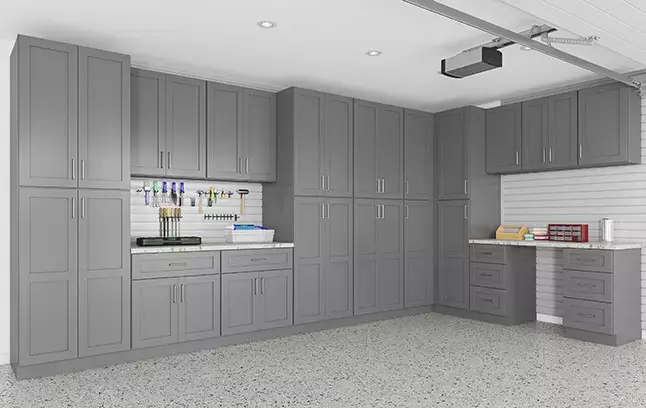To knock out piles and clutter, install countertop, shelving, cabinets, hooks and ceiling mounted storage in your garage. This will free-up floor space and provide a cleaner looking and feel to your garage.